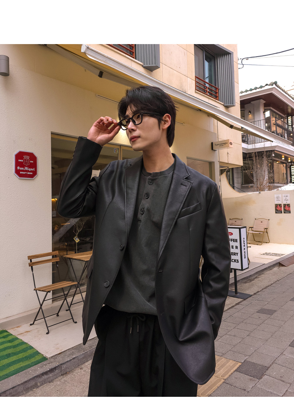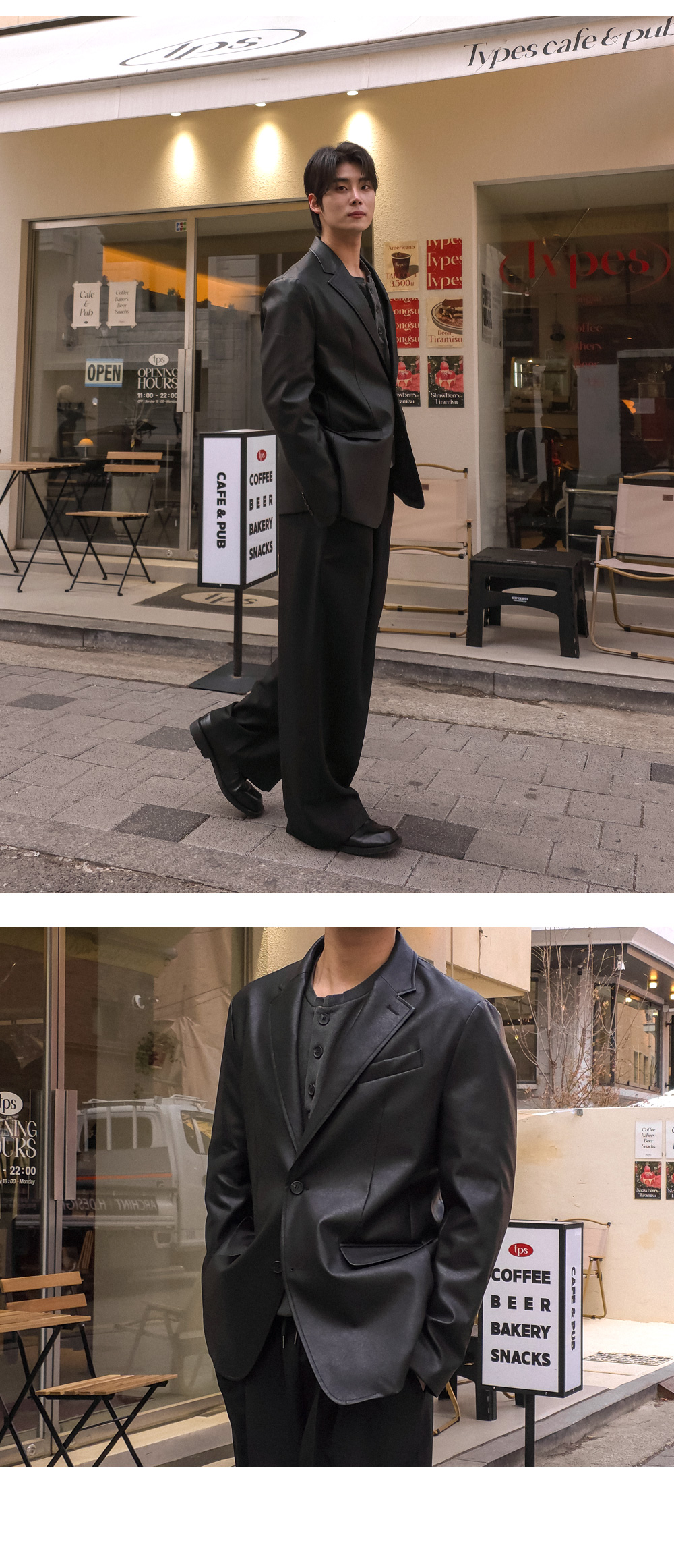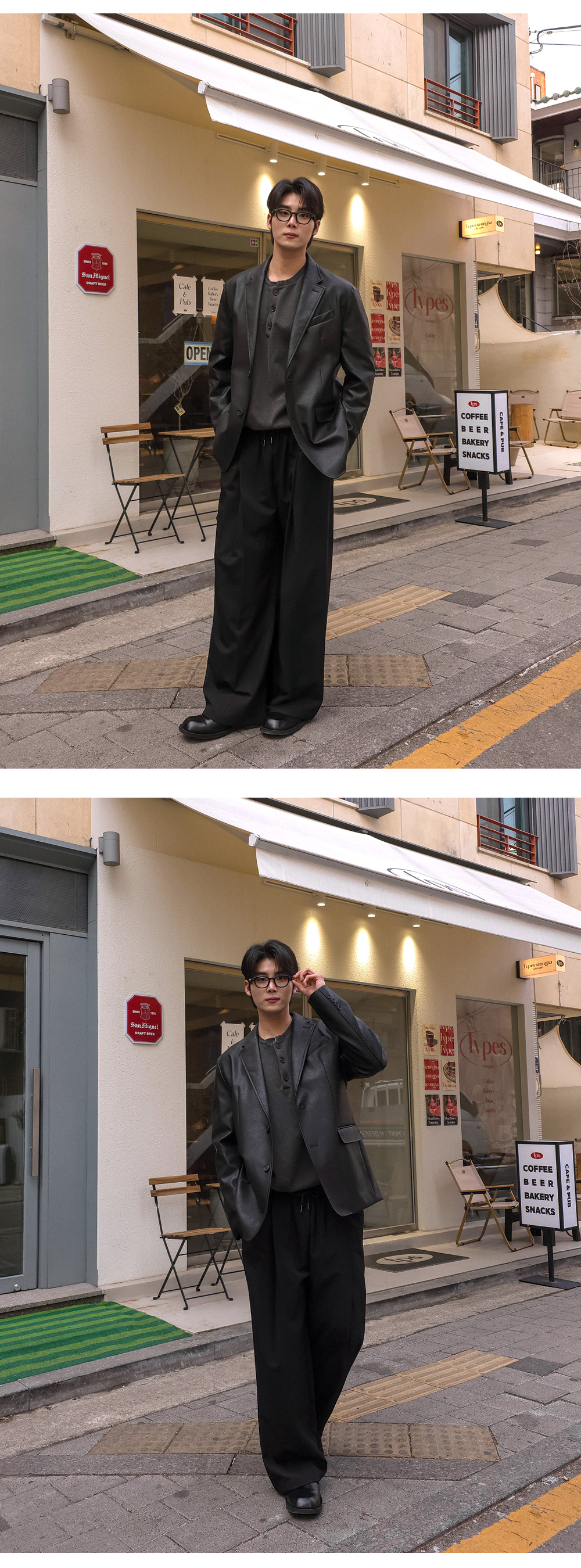 노치드 라펠 카라와 스냅 단추 디테일이 어우러져