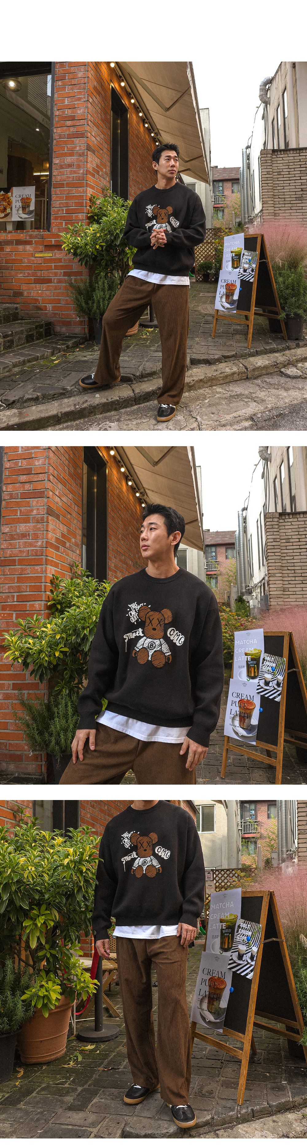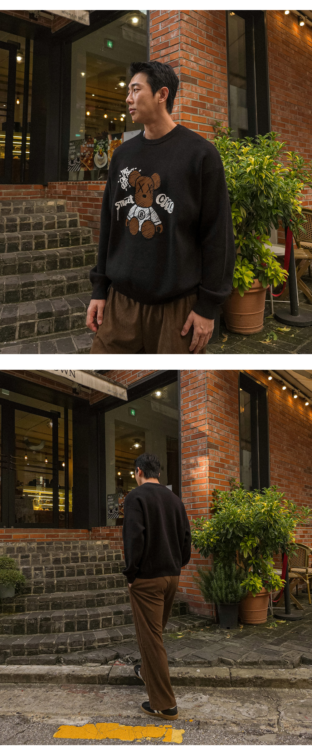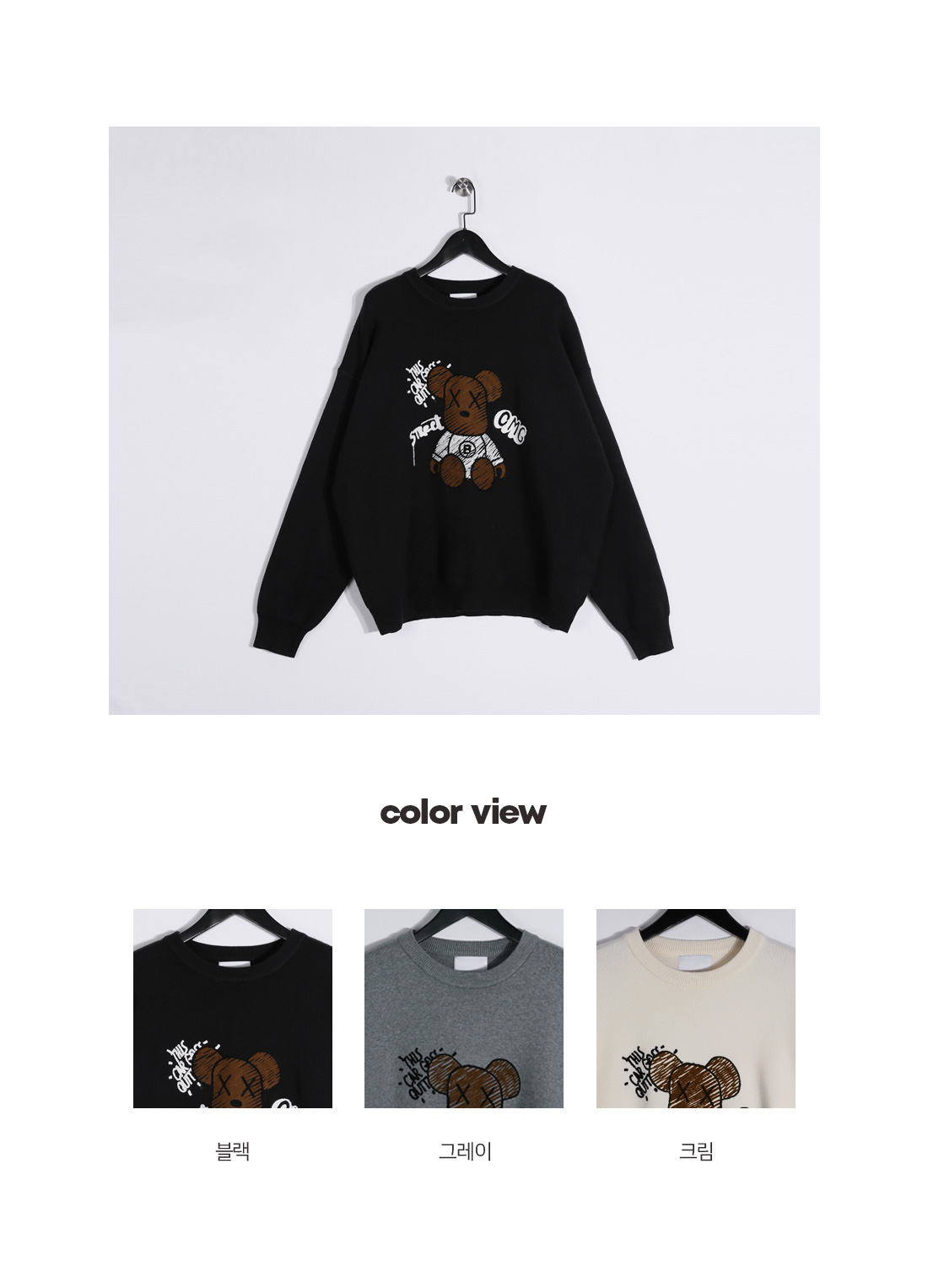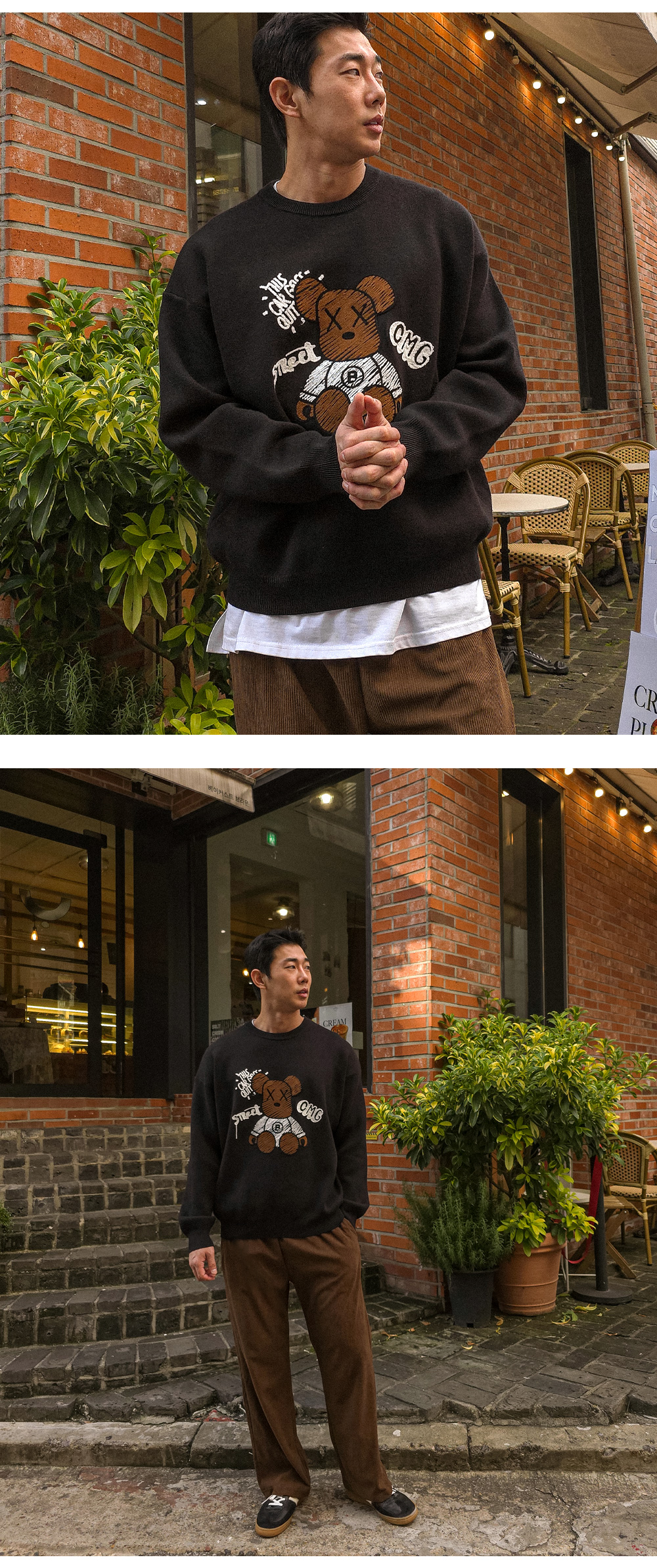 베어 그래픽으로 포인트를 준 루즈핏 니트입니다. 부드럽고 포근한 터치감의 니트 원사로 제작되어 장시간 착용에도 편안한 착용감을 제공합니다. 여유 있는 실루엣이 자연스럽게 떨어져 체형에 구애 없이 누구나 부담 없이 즐길 수 있으며, 프론트의 귀여운 베어 나염 디테일이 캐주얼한 매력을 더해줍니다. 단독으로는 물론, 셔츠나 아우터 안에 레이어드해도 감각적인 스타일링이 완성되며, 감성적인 무드와 캐주얼함을 동시에 연출할 수 있습니다. SIZE FREE 모델착용 [JUNBEOM]색상 : 블랙 / 사이즈 : FREE ![]() ![]() ![]() ![]() ![]() ![]() ![]() ![]()