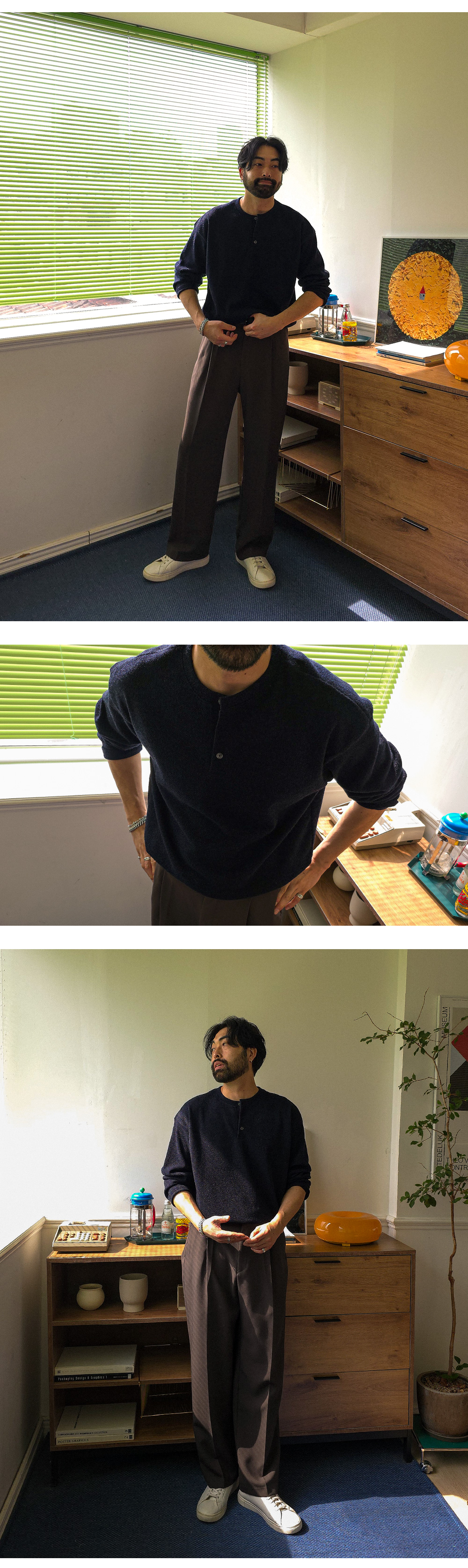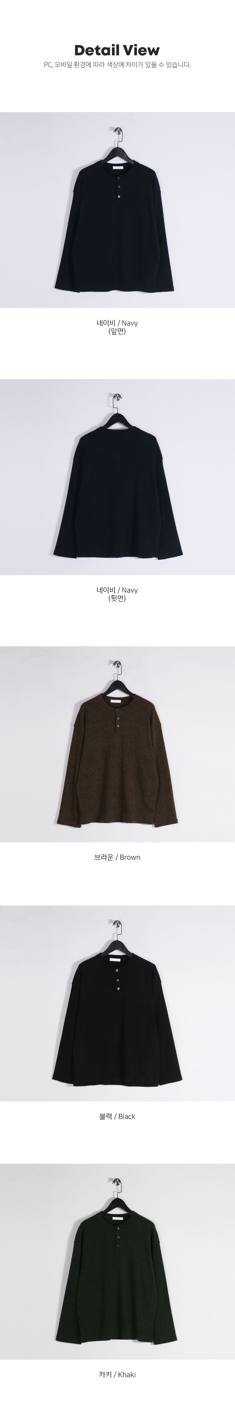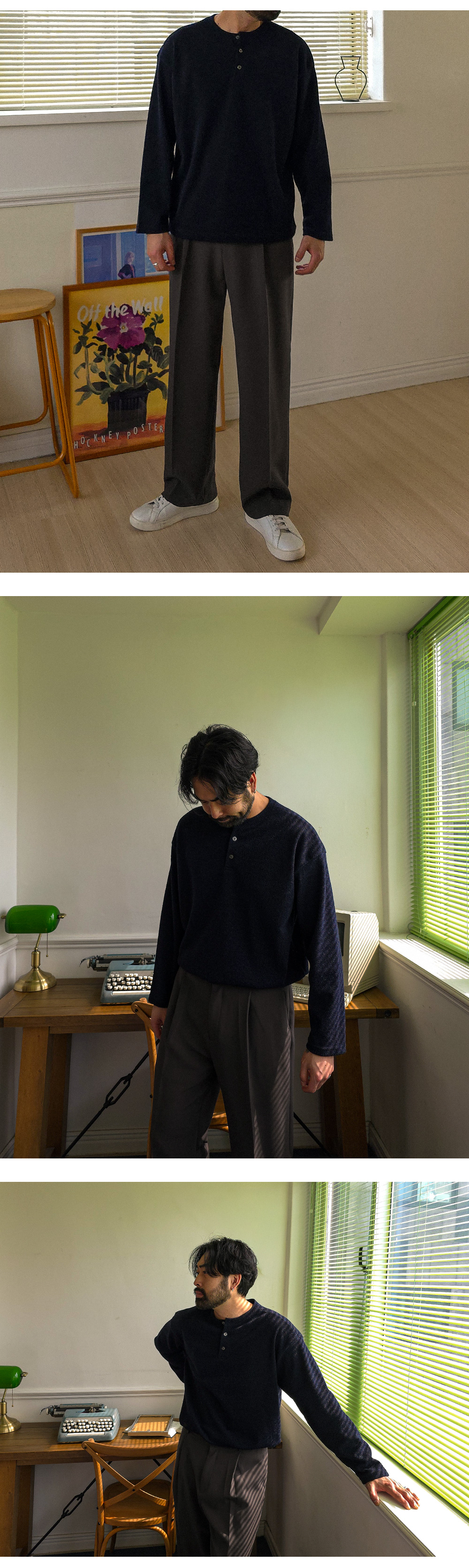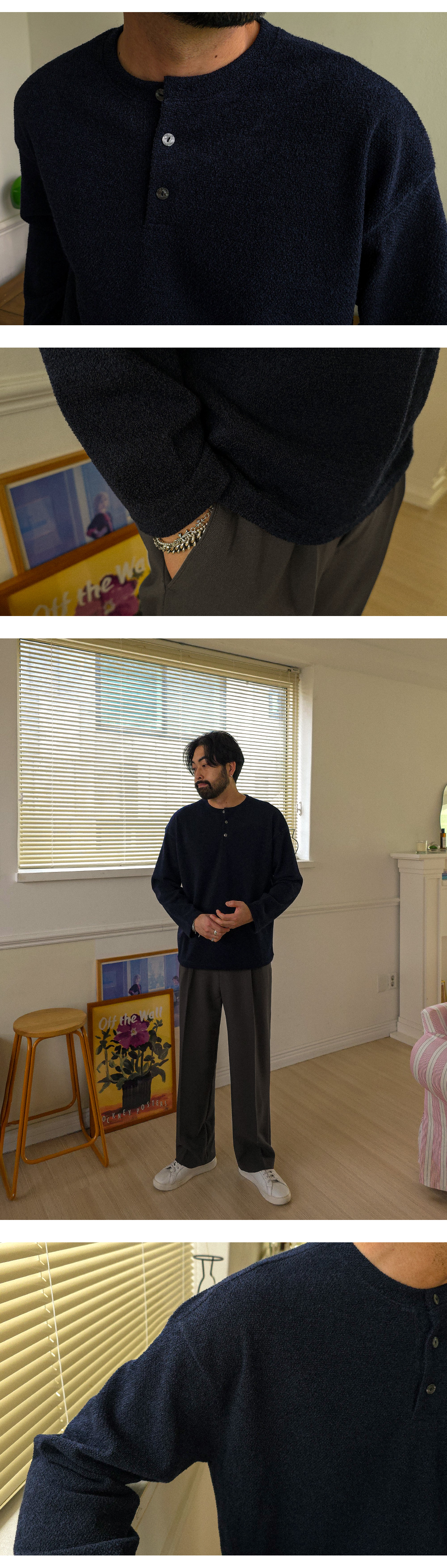 하나만 입어도 포인트가 되는 헨리넥 니트 긴팔 티셔츠입니다. 헨리넥 디자인으로 제작되어 캐주얼하면서도 멋스러운 분위기를 연출해 줍니다. 니트 특유의 신축성이 있어 착용 시 편안하고 자연스러운 핏을 느끼실 수 있습니다. 3버튼 디테일로 단독 착용은 물론, 이너 티셔츠와 레이어드하여 다양한 스타일로 연출하기 좋습니다. 슬랙스, 면팬츠, 데님팬츠 등 다양한 하의와 매치하기 좋아 데일리룩으로 활용도 높은 헨리넥 긴팔 티셔츠 입니다. SIZE FREE 모델착용 [KIHOON]색상 : 네이비 / 사이즈 : FREE ![]() ![]() ![]() ![]() ![]() ![]() ![]() ![]()